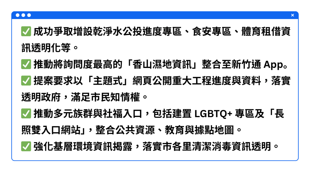 回顧這個任期,子齊針對市府網站與資訊揭露提出超過15筆提案,其中幾項已成功爭取: