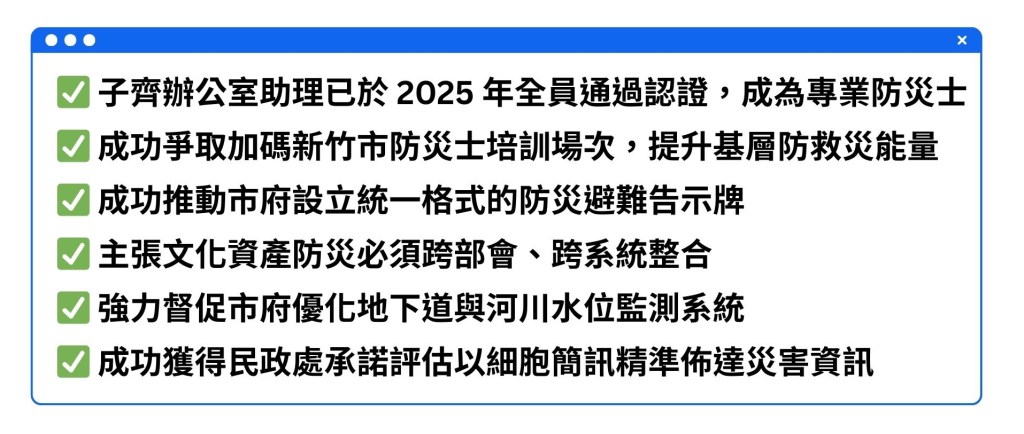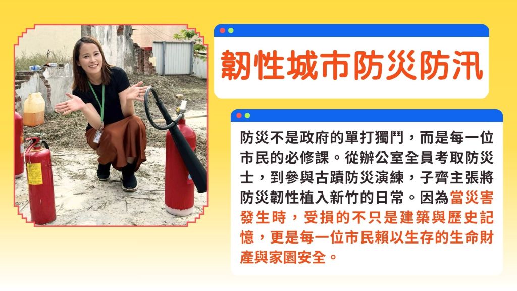 在硬體防禦與文化保護上,子齊 成功推動市府設立統一格式的防災避難告示牌,目前已完成三處實體設置,確保災時市民能迅速掌握避難資訊。針對古蹟密度極高的新竹,子齊每年參與國定古蹟防災實作演練,並主張文化資產防災必須跨部會、跨系統整合,唯有平時做好準備,才能在災難來臨時保護市民的生命不受威脅,讓城市的珍貴記憶得以延續。
