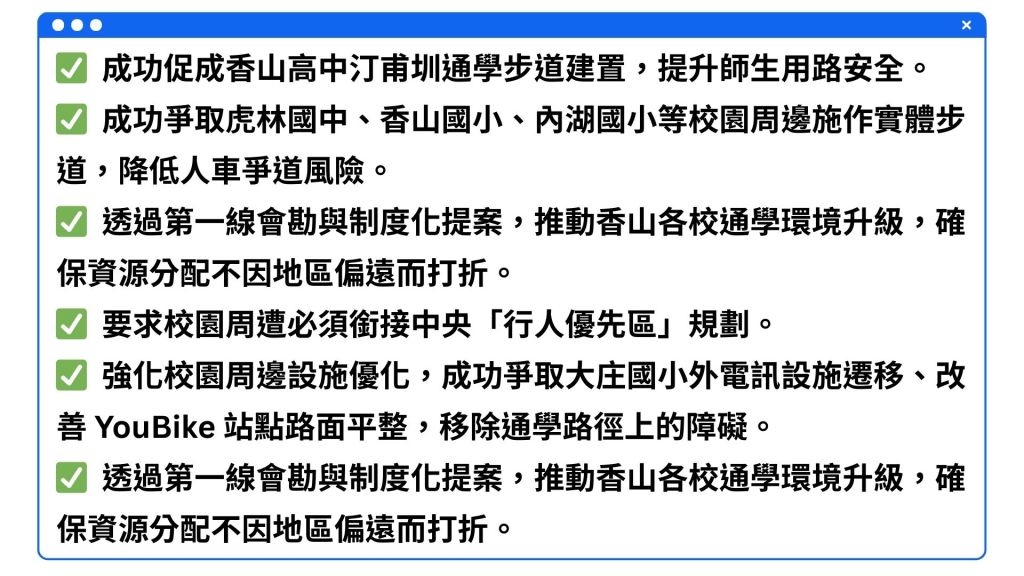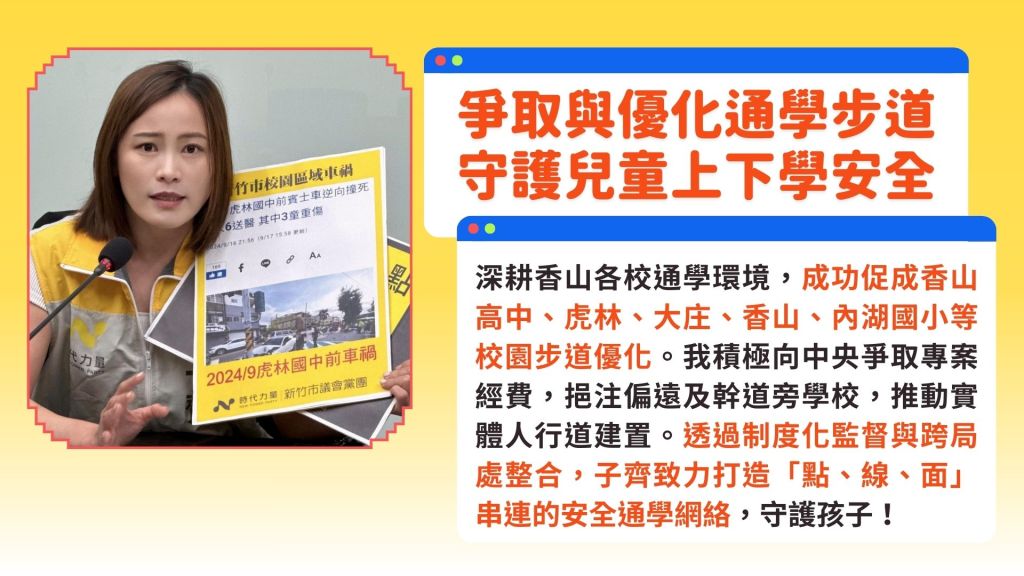 過去,新竹市的通學環境改善往往受限於預算與區域分配,特別是香山區許多學校位於非都市計畫區或交通幹道旁(如港南、南隘、內湖、大湖國小等)環境相對險峻。子齊不僅在議會強力要求跨局處整合,更積極向中央公路總局、接到醫生專案等爭取專案經費,主張通學步道應以「實體人行道」為原則,並同步改善視線死角與號誌時相。從「點」到「線與面」,我們正努力串連起一個讓孩子、長輩與推嬰兒車的家長都能自在走在新竹路上的安全網絡。