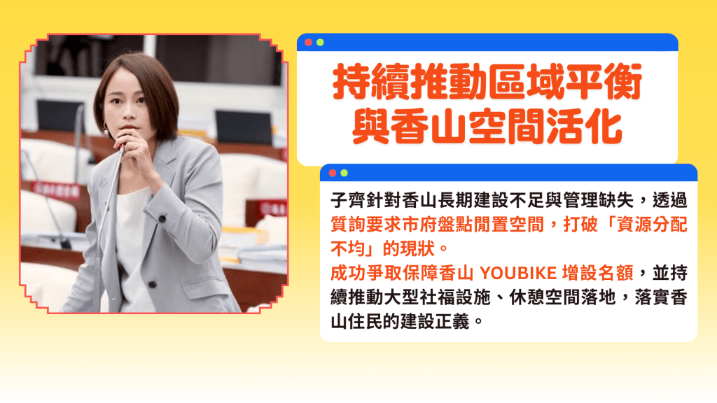區域平衡不能只是口號,必須體現在基礎設施的數據上。2024年新竹市 103 個 YouBike 站點中,香山僅佔 16 個,交通銜接嚴重落後。在定期會中,子齊透過質詢強烈要求市府,在2025年度新增站點中,至少保留四成名額給香山很高興後續確實保障了四個名額,但子齊會再持續努力爭取更多急需佔點的位置增設。