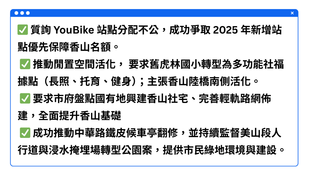 從任內成功推動中華路鐵皮候車亭的翻新我們可以看到,這些「有感的改變」證明了香山的無限可能。新竹市政府不應再以「空間不足」為藉口,更不能再忽視南香山住民與老幼族群的需求。香山的未來就是新竹市的未來,我會持續監督、積極爭取,讓香山從城市的邊緣,蛻變為大新竹發展中不可或缺的活力核心!