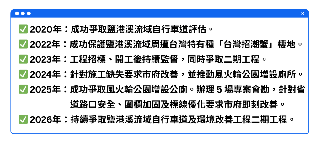 隨著鹽港溪自行車道 2023 年 7 月完成設計、10 月正式開工典禮,監督的重擔才真正開始。我深知「開工只是起點,完工才是考驗」,因此在工程期間我從未鬆懈。2024 年至 2025 年間,我針對施工缺失多次要求市府檢討改善。特別是針對居民反映強烈的「風火輪公園」配套不足問題,子齊親自辦理會勘,要求增設洗手間並檢討工程細節,最終成功爭取到公廁設置。