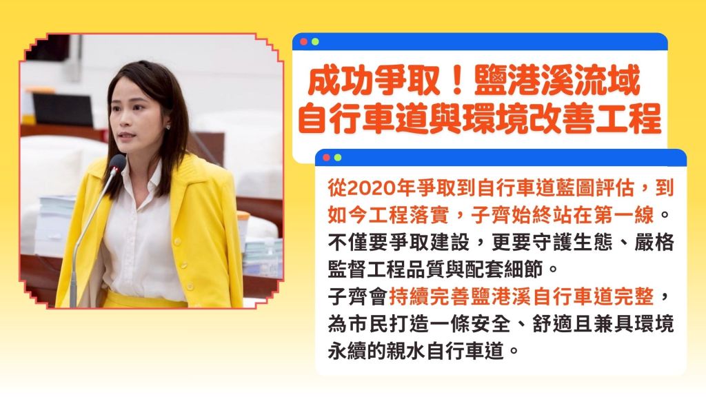 展望 2026 年,子齊的工作仍未結束。目前的成果僅是第一步,我將持續推動鹽港溪流域環境改善二期工程,爭取更多綠美化與夜間照明優化,讓這條自行車道真正成為鄉親引以為傲的休閒地標。我會帶著這份監督的韌性,繼續為大家看緊預算、守護品質,確保每一分建設經費都轉化為市民看得見、用得到的幸福感。